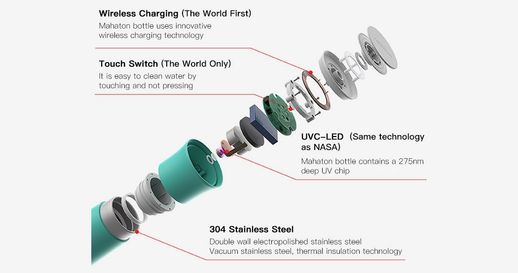 瓶蓋內(nèi)裝有紫外線LED殺菌裝置,照射進(jìn)瓶中,反射到瓶口的金屬表面,殺死水中的任何微生物,并去除任何臭味。先進(jìn)的275nm紫外線可以在90秒內(nèi)輕易殺死瓶子里的任何細(xì)菌,保證每次滅菌后水源都是純凈。水杯本身配備了獨(dú)特的無(wú)線充電底座,使水杯有效防水,也有助于你輕松地為Mahaton的紫外線裝置充電。